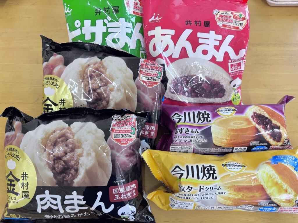 さあ今回は肉まんあんまん、ピザまん、そして今川焼きです。今川焼きはあんこ🫘とクリームの2種類です。肉まん対今川の対決は、今川焼きの勝ちでした