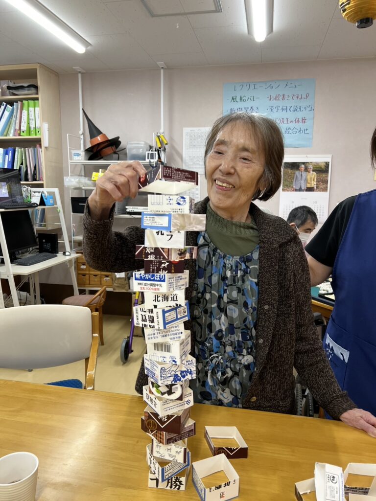 テーブルゲームでは、牛乳パックを使ったジエンが!職員と代わりばんこにひとつずつ積み上げ対決‼️いやあ〜すごい😍