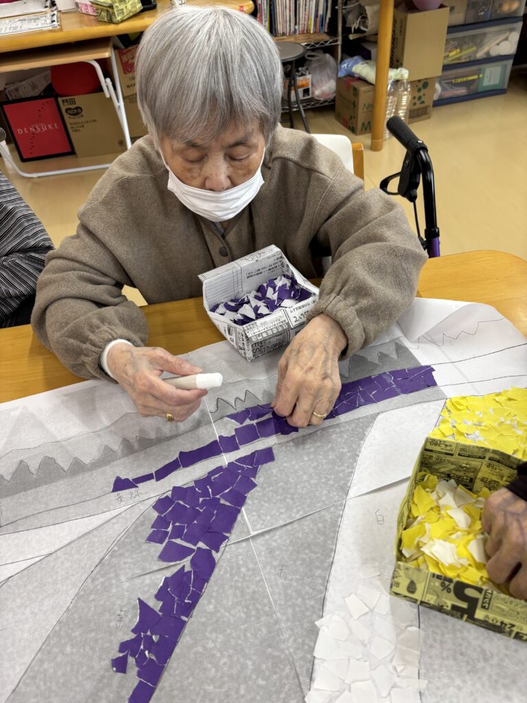 また室内では一足先に色取り取りの紙を千切り絵にして花畑の壁面を飾りました