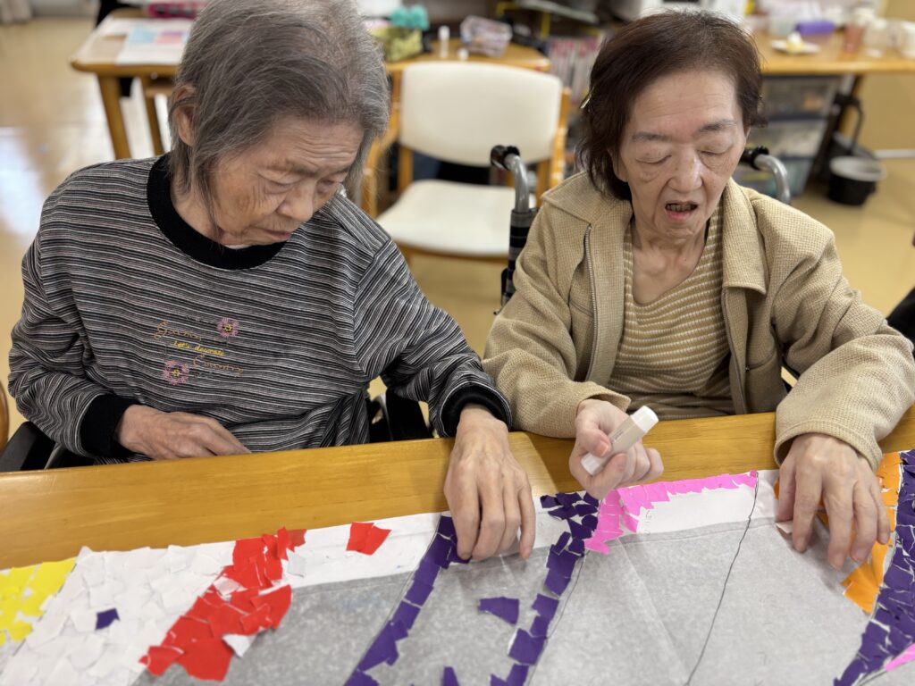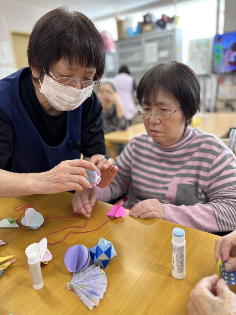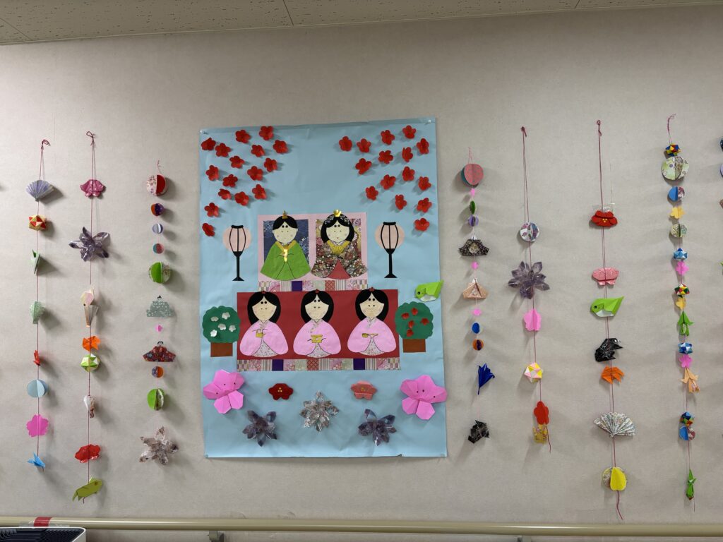 やわらかな春の陽気に包まれ、少しずつ季節の移ろいを感じる頃となりました。皆さまいかがお過ごしでしょうか。3月はひな祭りに向けて、折り紙で飾り作りを行いました。