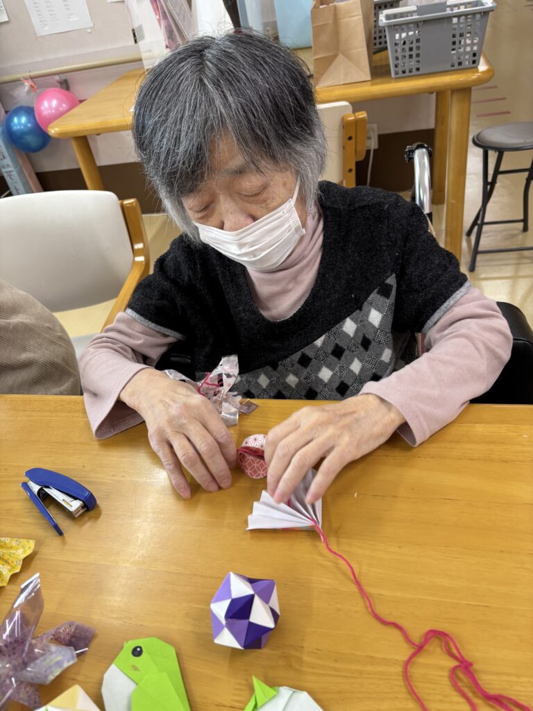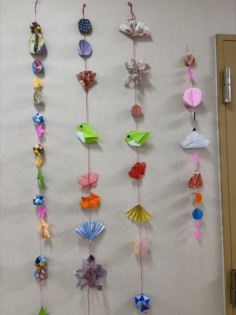 折り紙が得意な職員を中心に、スタッフが色々なパーツを作り皆さんに好きなパーツをひとつひとつ丁寧に繋げて仕上げていき、色とりどりの素敵な吊るし飾りが完成しました。