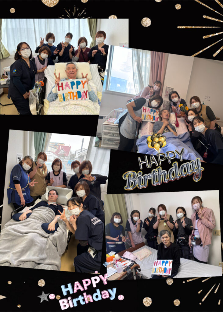 4月はお誕生日を迎えられた方が多く、にぎやかであたたかなひと月となりました。お誕生日の日には、職員のコーラス部隊がお部屋を訪問し、歌のプレゼントをお届けしました。