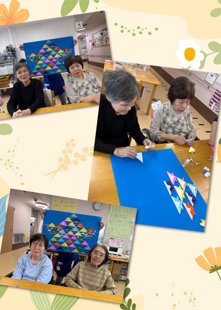 フロアでは、こどもの日に向けて鯉のぼりや兜の折り紙作りを行いました。色とりどりの作品が飾られ、フロア全体が明るく、季節感あふれる空間となっています。