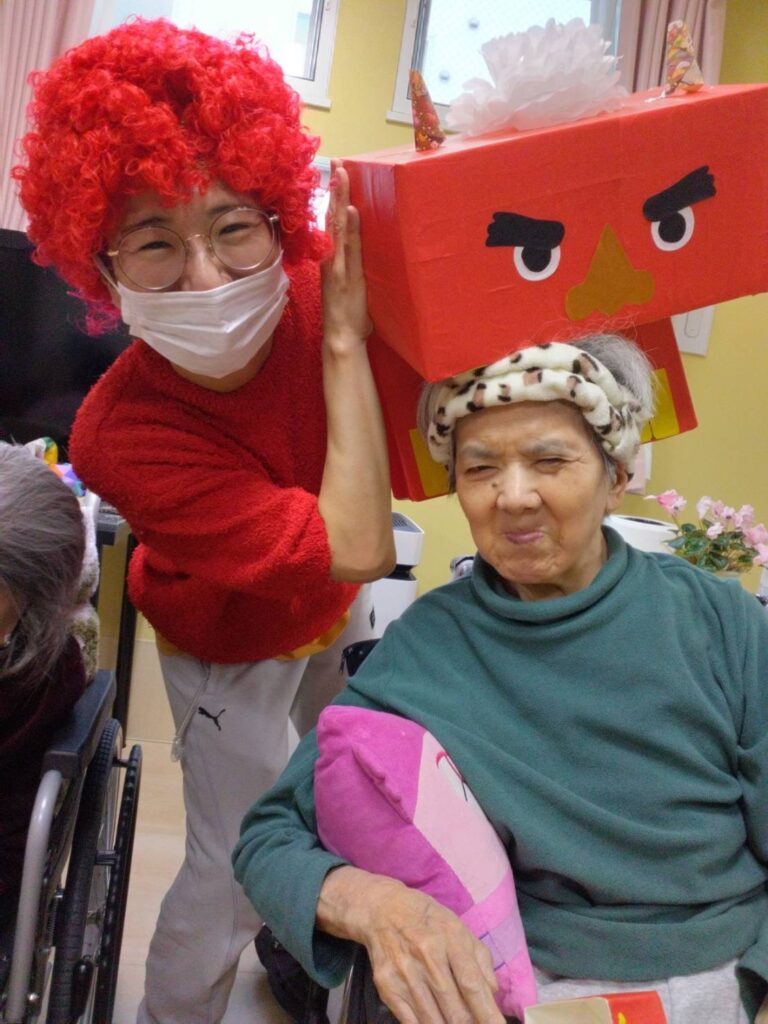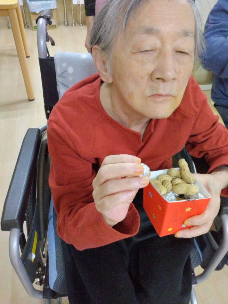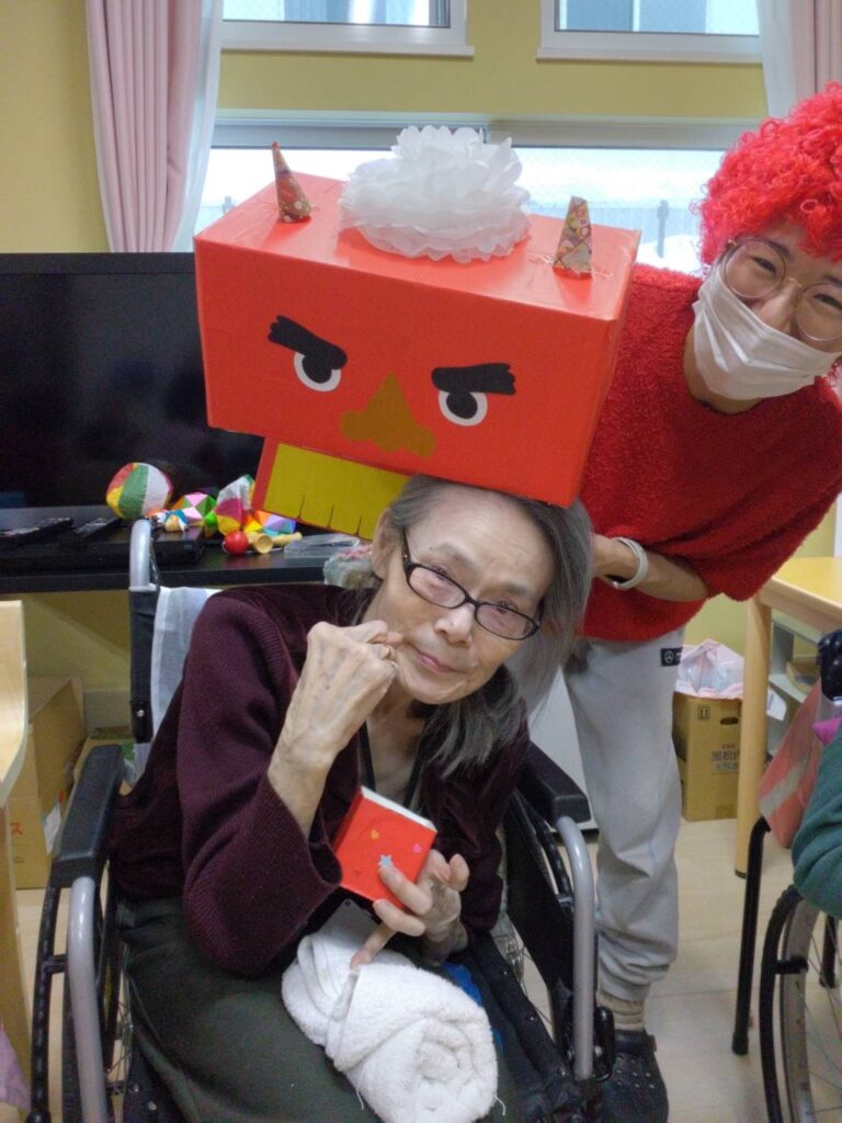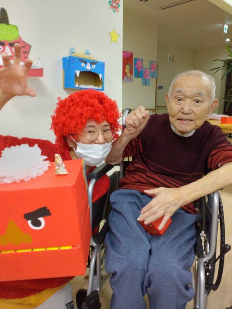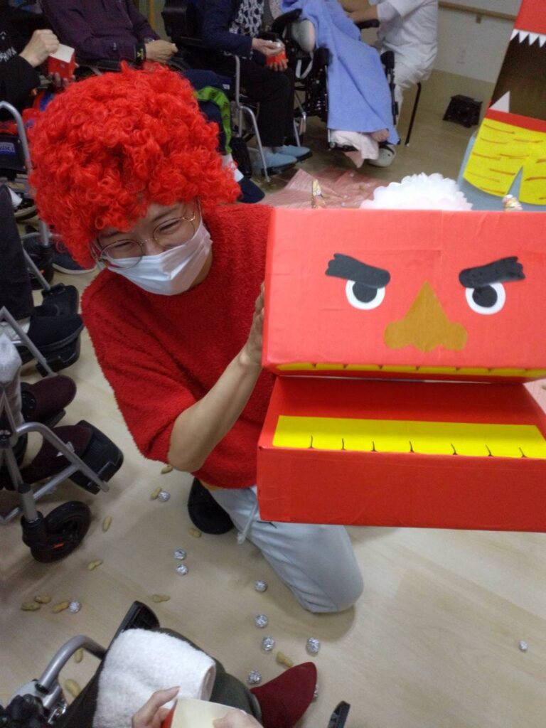 鬼に向かって豆を投げる利用者様の表情はとても生き生きとしており、